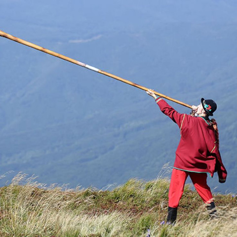 今回、私はユニークな吹奏楽器トレンビタを皆さんに紹介します。スロヴェニア人やウクライナ人、ポーランド人、クロアチア人の間で用いられている民族楽器で、ウクライナのカルパティア山脈の東部や南西部のフツーリシュチナで広く使われています。トレンビタは、大昔は村の羊飼いの連絡手段として用いられていました。羊飼いはトレンビタを使って、家畜の群れの到着や放牧の場所を同じ村の住人に伝えたのです。このトレンビタの独特の音色が、遠く離れた場所から人々に情報を前もって伝えることで、様々な危険から回避することができました。戦争の時には、トレンビタは侵略者が近づいてくることをも知らせたのです。